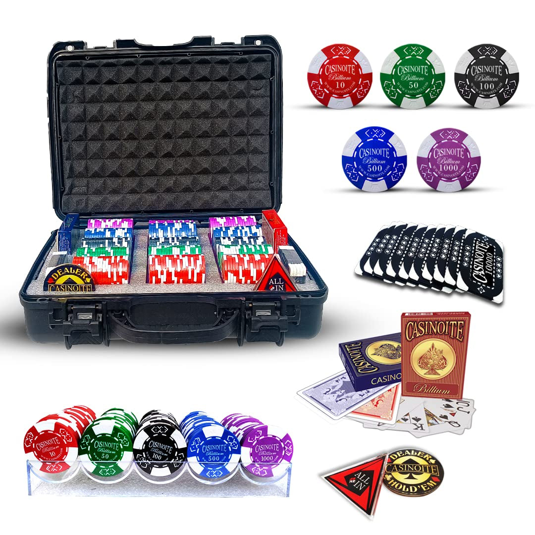 This all-in-one casino poker set includes 300 high-quality chips, 10 denomination bricks, 3 chip trays, 2 decks of playing cards, 1 dealer button, 1 all-in button, and a sleek black carrying case. Perfect for home games and poker nights.